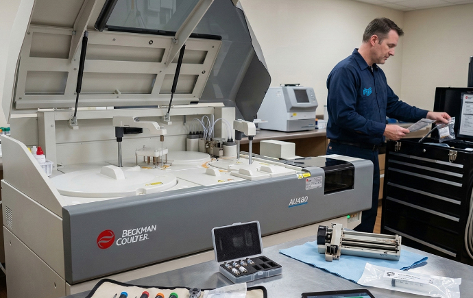 The AU480’s daily and weekly maintenance is straightforward enough that most labs handle it in-house: DI water checks, probe and cuvette wash verification, ISE reagent loading and cleaning. But when it comes to quarterly or annual PM visits, photometer lamp replacements, syringe bank inspections, or anything that requires opening the analyzer up, most labs need outside help.