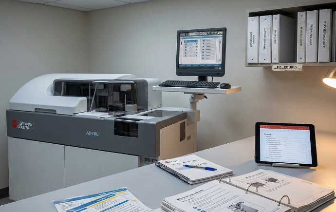 The AU480 ships with several documents that operators rely on every day. The main one is the User’s Guide (PN B28624AA), which covers startup procedures, sample handling, the test menu, maintenance schedules, and error code reference. There's also the Quick Response Guide for condensed troubleshooting steps, the In-Lab Training Manual, and various maintenance job aids that cover daily, weekly, and monthly procedures. Some labs also need the service manual or ISE-specific documentation for more advanced work.