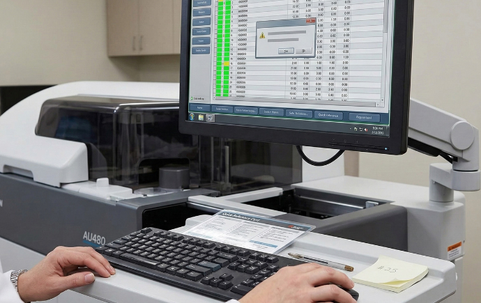 At the bench level, what has kept the AU480 popular for so long comes down to a few things. It processes up to 400 photometric tests per hour, or up to 800 when running ISE electrolytes. It supports up to 63 onboard analyte methods simultaneously. The quartz cuvettes in the cuvette wheel are durable and reusable instead of disposable, which keeps consumable costs down. The ISE electrodes are rated for 40,000 samples or six months, whichever comes first. The dry bath design means there is no water bath to maintain. And the graphical user interface is standardized to the AU680, so techs moving between AU-series instruments do not have to relearn the software.