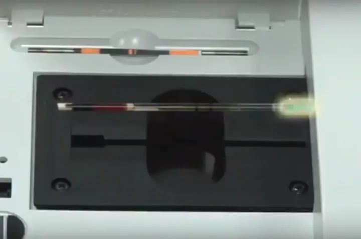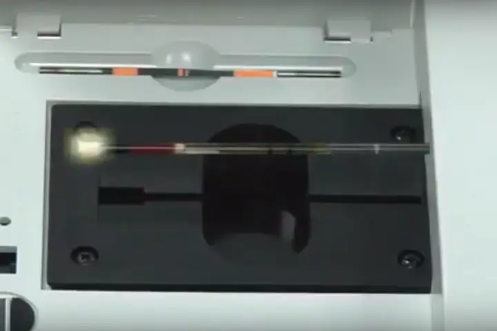 First, place the accu-tube in the Autoread Plus Analyzer, with the stopper facing left