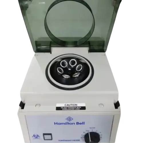 The constant speed motor and electronics provide smooth performance, efficient operation, greater reliability, and long life. The transparent polycarbonate protective cover allows for visual inspection of the tubes. This high-performance system operates at relatively high speeds (up to 3500 RPM) combined with a fixed angle design for performing highly efficient separation of blood and materials of different densities and high deposition rates. Hamilton Bell Vanguard V6500 model has a maximum centrifugal force (rcf) 1318.